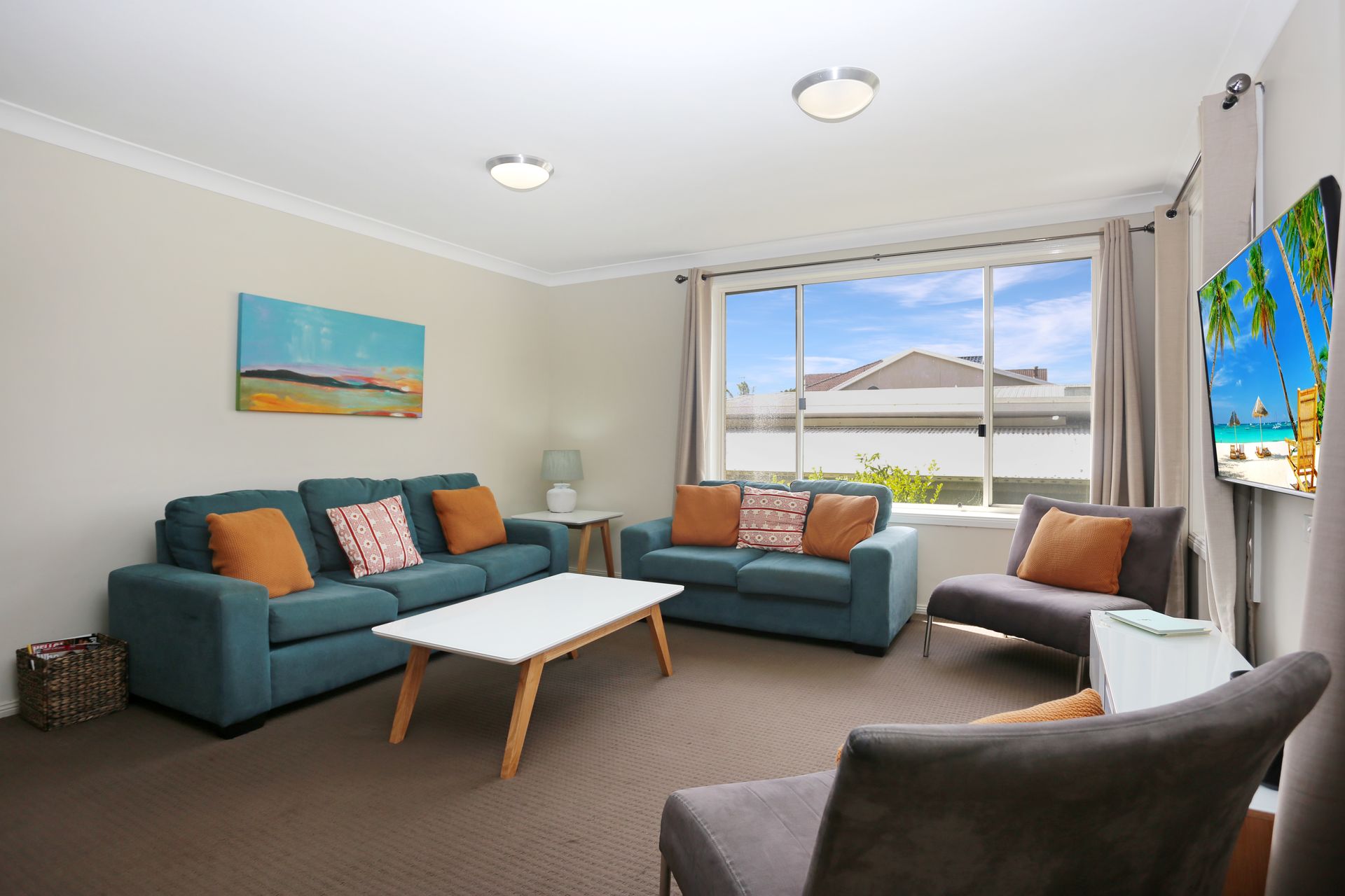 There is an ensuite off the main bedroom and a second bathroom for the other two bedrooms. The main bedroom has a built-in robe and a queen-sized bed with comfortable furnishings. The second bedroom has a queen-sized bed with built-in and the third bedroom has 2 singles and a trundle bed also with a built-in robe. Ceiling fans are provided in each of the bedrooms to complement the sea breeze.