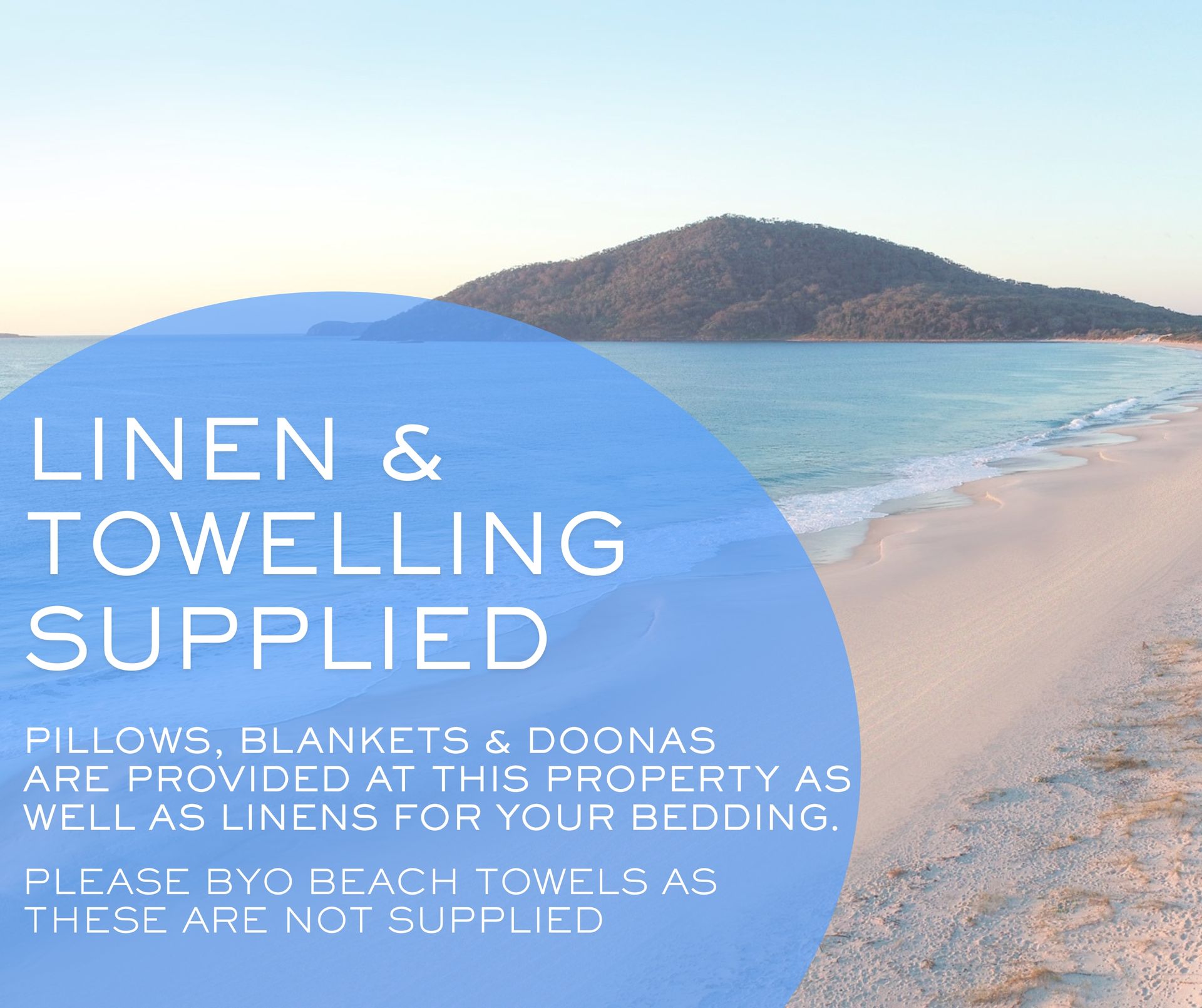 -Linen Supplied, you need to bring your own toiletries etc.