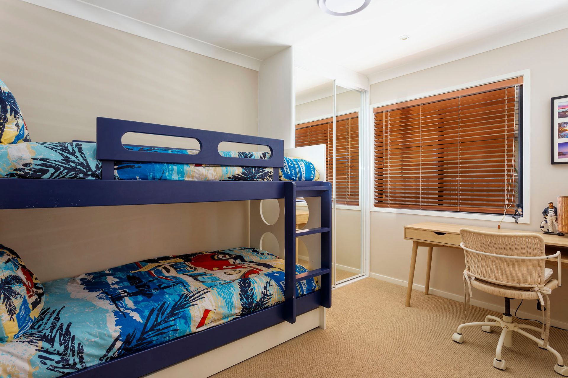 There are four bright and roomy bedrooms, all with in-built robes. No expense has been spared on top quality, luxurious bedding and furnishings designed to give you the best night sleep possible. The expansive master suite has a luxe king bed, TV and spacious ensuite complete with jacuzzi where you can relax after a day on the beach or golf course. The flexible second bedroom has two comfortable single beds (or push together for a Queen). The third bedroom has a set of bunk beds, with pull out trundle. The light and airy fourth bedroom contains a deluxe queen bed with stunning garden outlook.