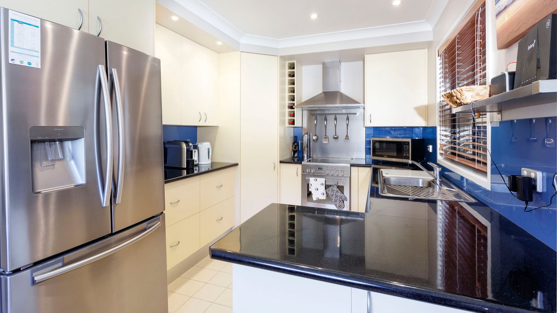 The kitchen is fully equipped with modern appliances including dishwasher, luxury fridge and coffee maker.